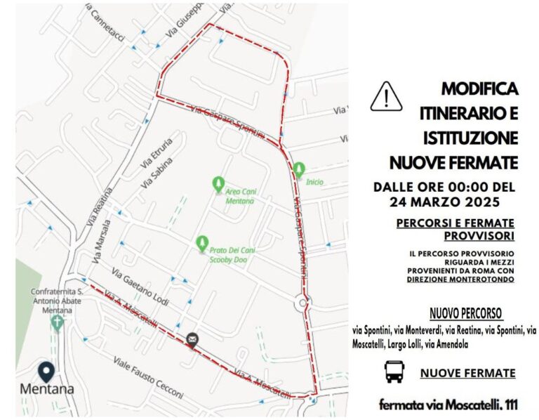 NUOVO ITINERARIO TRASPORTO LOCALE E MEZZI CO.TRA.L A MENTANA IN DIREZIONE MONTEROTONDO PROVENIENTE DA ROMA E DA PALOMBARA SABINA ISTITUZIONE NUOVA FERMATA TEMPORANEA SU VIA MOSCATELLI Si comunica alla cittadinanza che per migliorare la sicurezza sia pedonale che veicolare lungo il percorso attuale dei mezzi del trasporto pubblico locale e per risolvere l’attuale criticità costituita … Leggi tutto NUOVO ITINERARIO TRASPORTO LOCALE