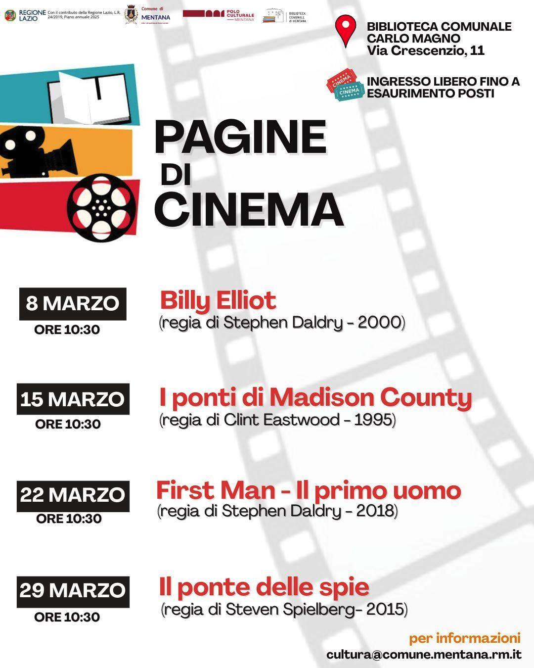 MatinĂ©e domenicali dedicata alla visione di un film presente in biblioteca Biblioteca comunale di Mentana Carlo Magno, via Crescenzio 11 10:30 Scopri il programma completo 8 marzo Billy Elliot (regia di Stephen Daldry – 2000) 15 marzo I ponti di Madison County (regia di Clint Eastwood – 1995) 22 marzo Fist man – primo uomo … Leggi tutto PAGINE DI CINEMA
